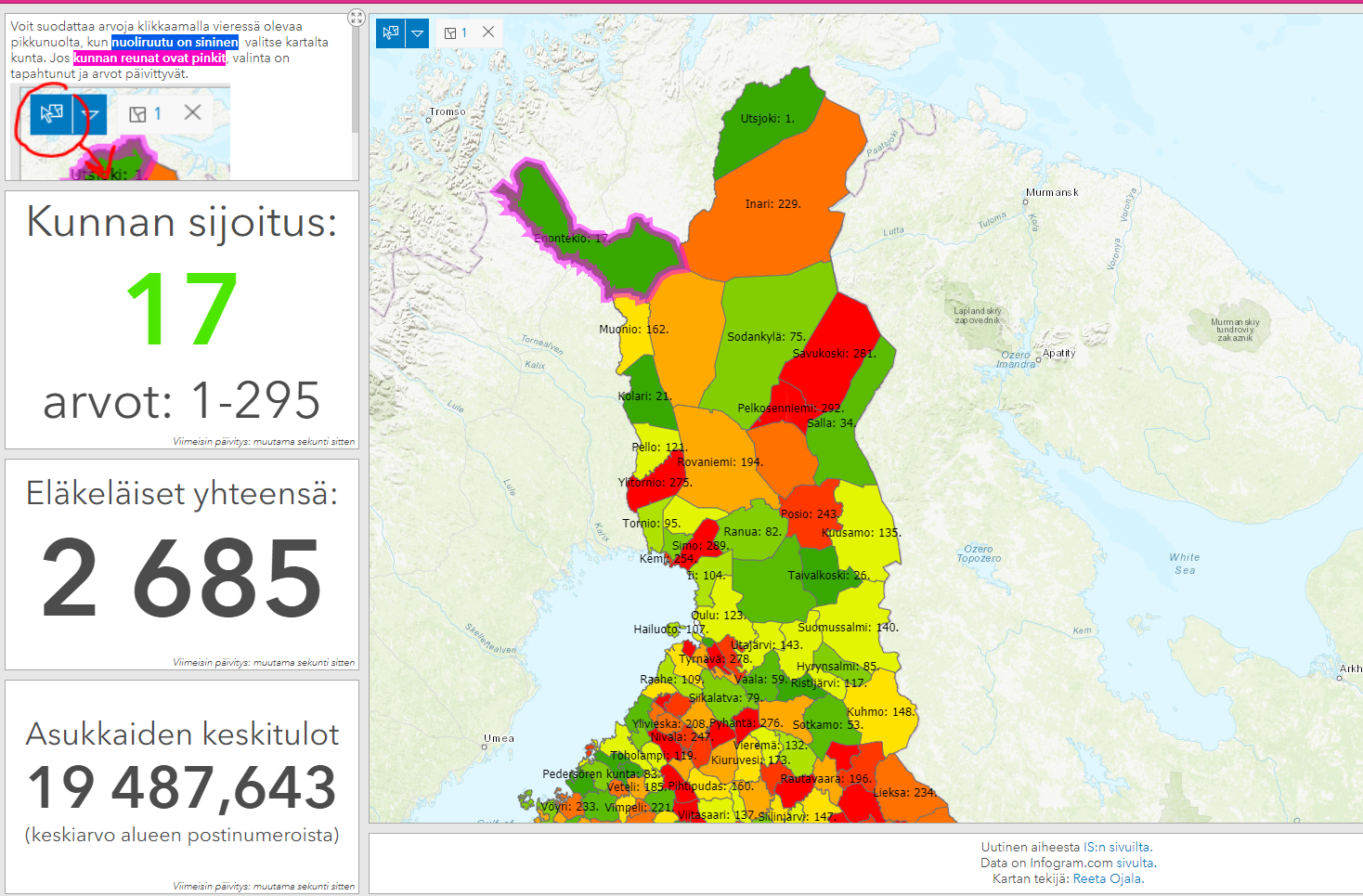 Iltasanovat uutisoivat seniorihoitojen tasosta eri kunnissa. Laitoin kuntien sijoitukset kartalle. Hyvä Utsjoki ykköspaikasta! tutustu karttaan: http://arcg.is/1eP5n1 IS-uutinen: https://www.is.fi/kotimaa/art-2000006031742.html?fbclid=IwAR10u9mnmZcdFSO2nTeJWH99UKJ8aNXMEtNLo4Rfvx30mfYr0I4zbpPSzUM